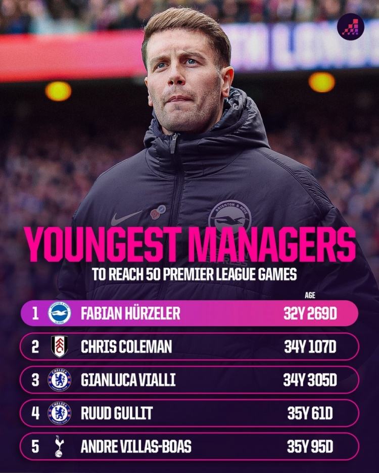 11月20日讯 Opta统计了教师已毕英超50场里程碑时的年事,比肩出英超握教50场最年青主帅名次,赫尔泽勒居首。