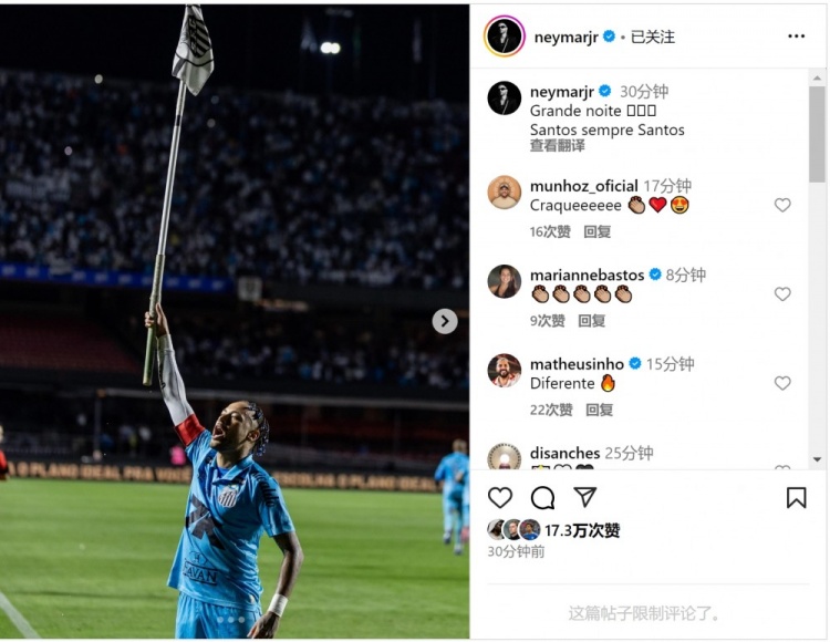 内马尔社媒晒出高举角旗杆庆祝的像片,配文:“机要的夜晚,桑托斯永久是桑托斯。”