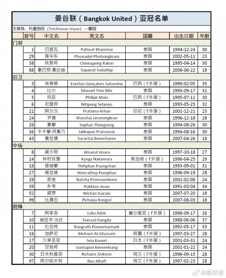 8月5日讯 据博主“泰好波”音信,曼谷联公布作客成皆蓉城的亚冠精英联赛阅历赛名单,球队9外助出征。凭据赛程,曼谷联vs蓉城的比赛8月12日19:35进行。