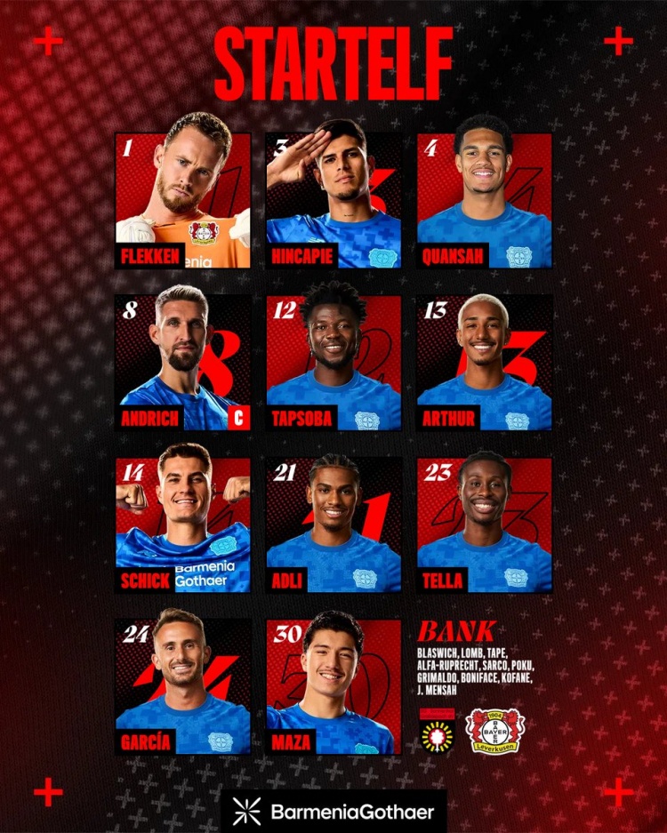勒沃库森首发:1-弗莱肯、3-因卡皮耶、4-宽萨、8-安德里希、12-塔普索巴、13-阿图尔-奥古斯托、14-希克、21-阿明-阿德利、23-内森-泰拉、24-阿莱克斯-加西亚、30-马扎