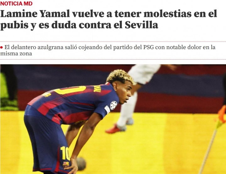 10月03日讯 据《寰宇体育报》最新讯息,巴萨球星亚马尔的耻骨区域再次出现严重不适,球员出战塞维利亚成疑。