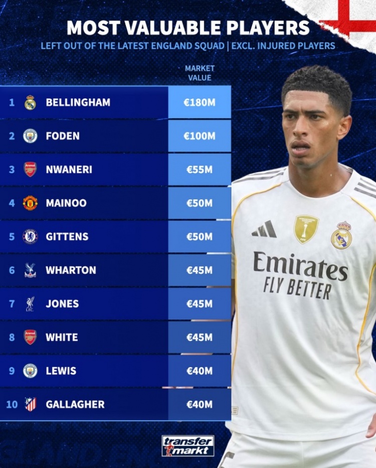 10月3日讯 英格兰公布了最新一期球队名单,德转也盘货了本次未能入选的球员身价榜(受伤球员以外),具体如下: