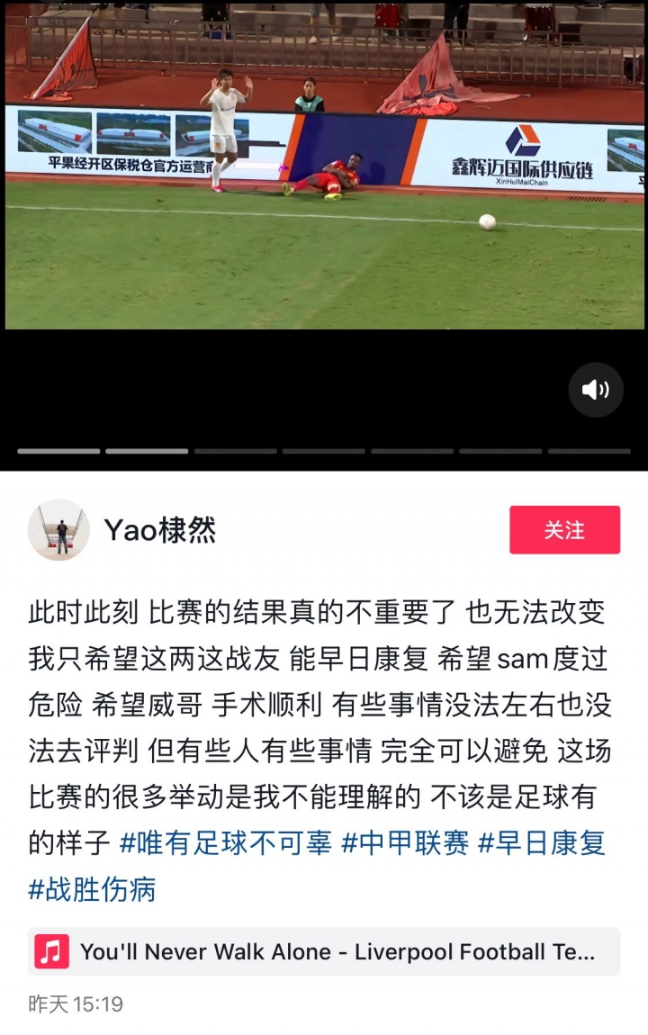 广西平果球员姚棣然在社媒写谈,“此时此刻,比赛的恶确切的不遑急了,也无法窜改。我只但愿这两这战友,能早日康复,但愿sam(阿萨莫阿)渡过危境,但愿威哥(黄威)手术顺利。有些事情没法傍边也没法去评判,但有些东谈主有些事情,王人备不错幸免。这场比赛的许多举动是我不成调理的,不该是足球有的容貌”。