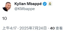 07月24日讯 姆巴佩刚刚更新社媒,推行仅一个数字“10”,疑似自宣接过皇马10号球衣。