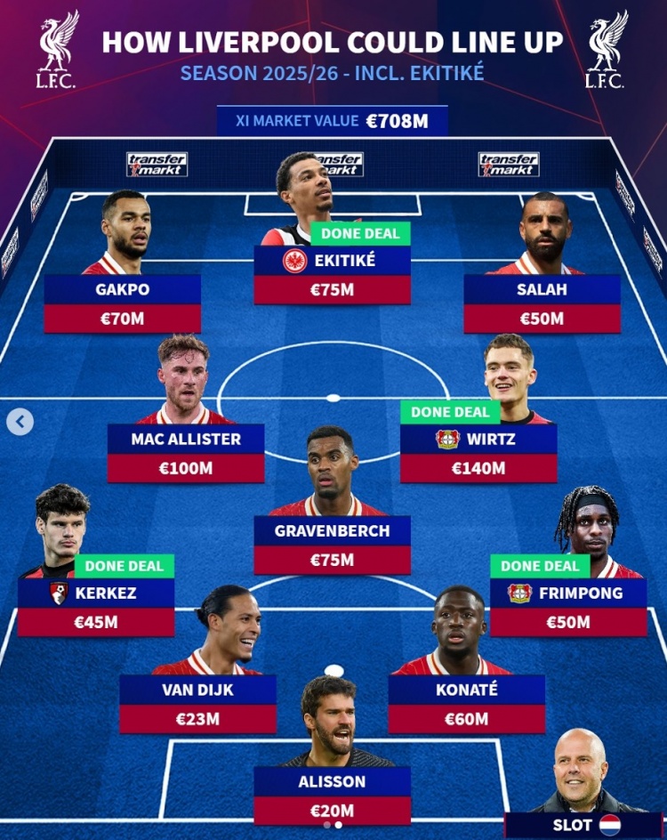 7月24日讯 利物浦一经官宣签下埃基蒂克,《转会市集》也瞻望了赤军新赛季主力气势,今夏4大新援在列。