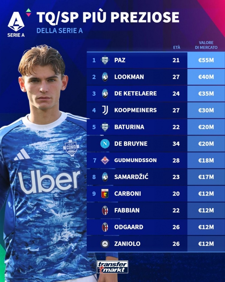 5、巴图里纳(科莫):22岁,2000万欧