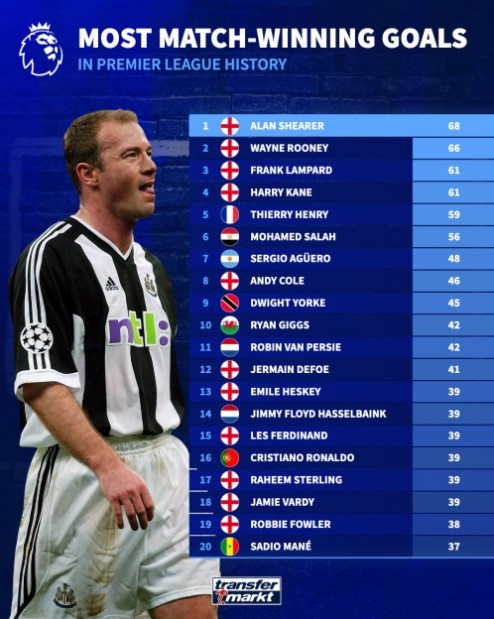 10月17日讯 德国转会商场盘货了英超历史打进制胜球排名情况,希勒以68球居首,鲁尼66球位居次席。