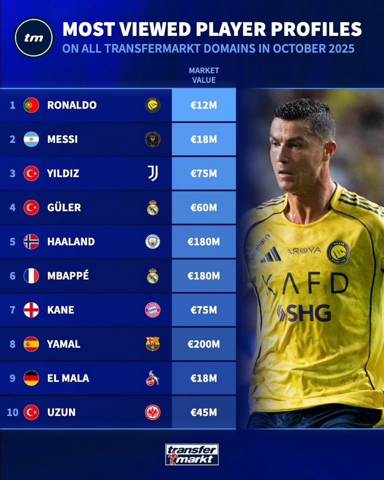 你的位置:葡超直播 > 法甲联赛 > 10月德转球员页面浏览量名次:C罗居首,梅西、伊尔迪兹二三位