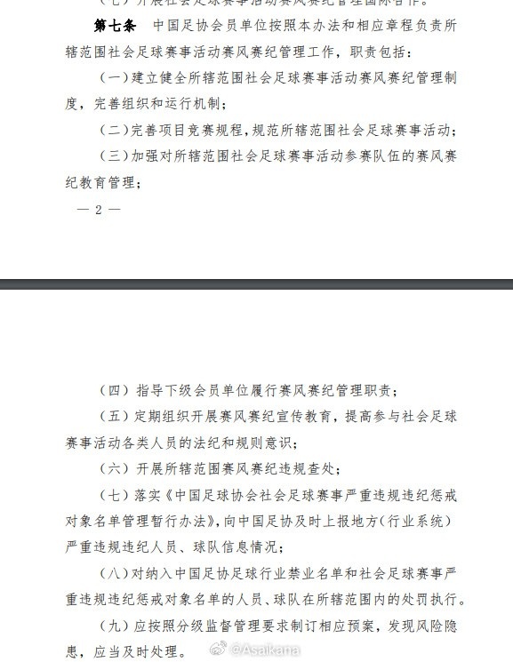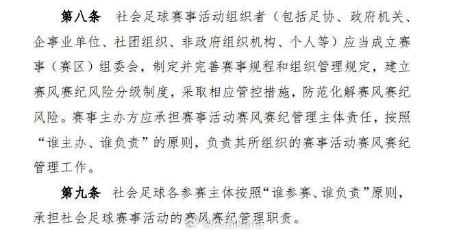 诚然了,凡是对中国足协责任有点了解,懂点新体育法的,梗概看过这个文献的,齐不至于念念出个这样搞笑的关系。因为这个文献出台配景是苏超出生之前的事情,内部以至空口无凭律例了分好了中国足协和场所足协、社会办赛方的权柄义务,以至律例场所赛当事人理者才是赛风赛纪第一包袱东说念主,巨大球迷深恶痛疾的赛风赛纪问题当今捋顺了明确的责任单干,反而对苏超这类社会赛事来说是个大大的功德。