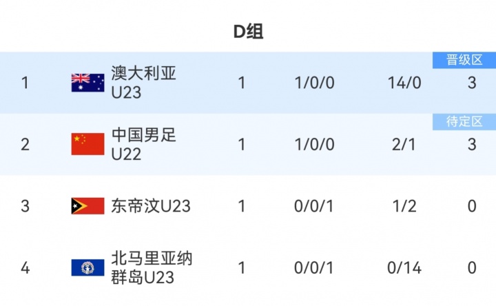 你的位置:葡超直播 > 西甲赛事 > 净胜球大幅过时!D组积分榜:澳大利亚14个净胜球第1,U22国足第2