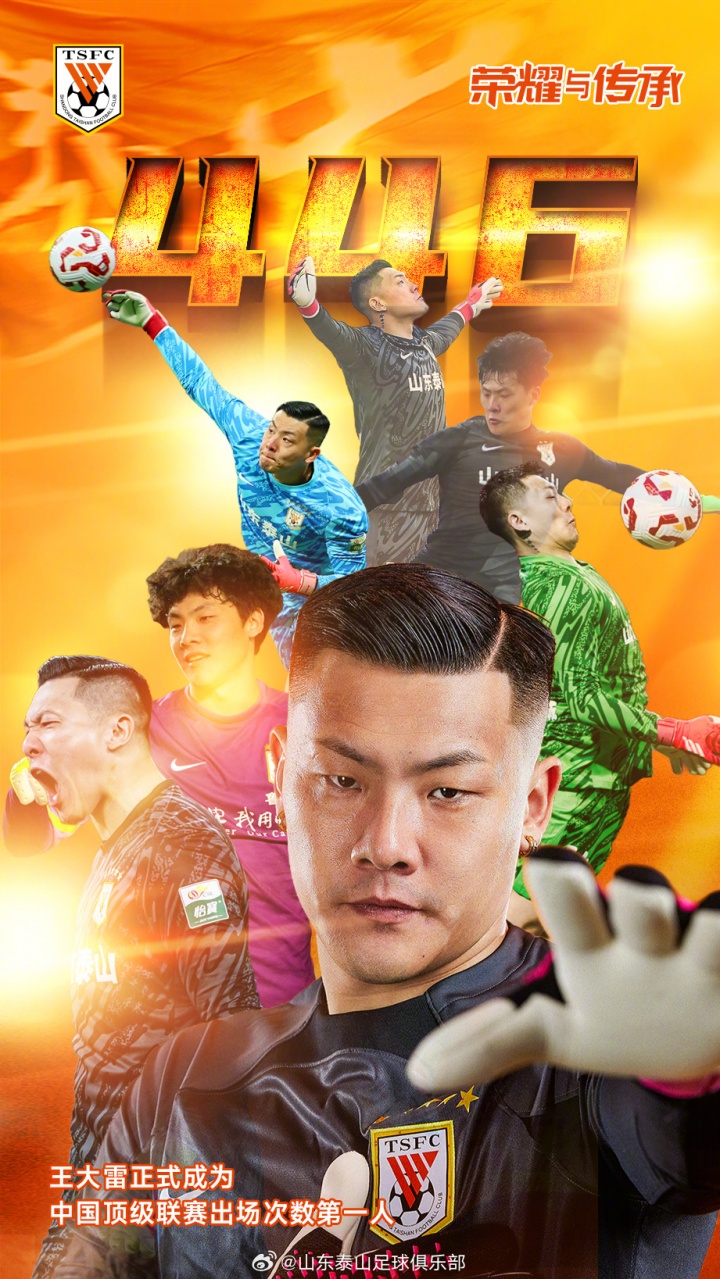 在当天山东泰山3-0打败梅州客家的比赛,王大雷首发登场,以446次出场高出汪嵩,崇拜成为中国顶级联赛出场次数第一东谈主。