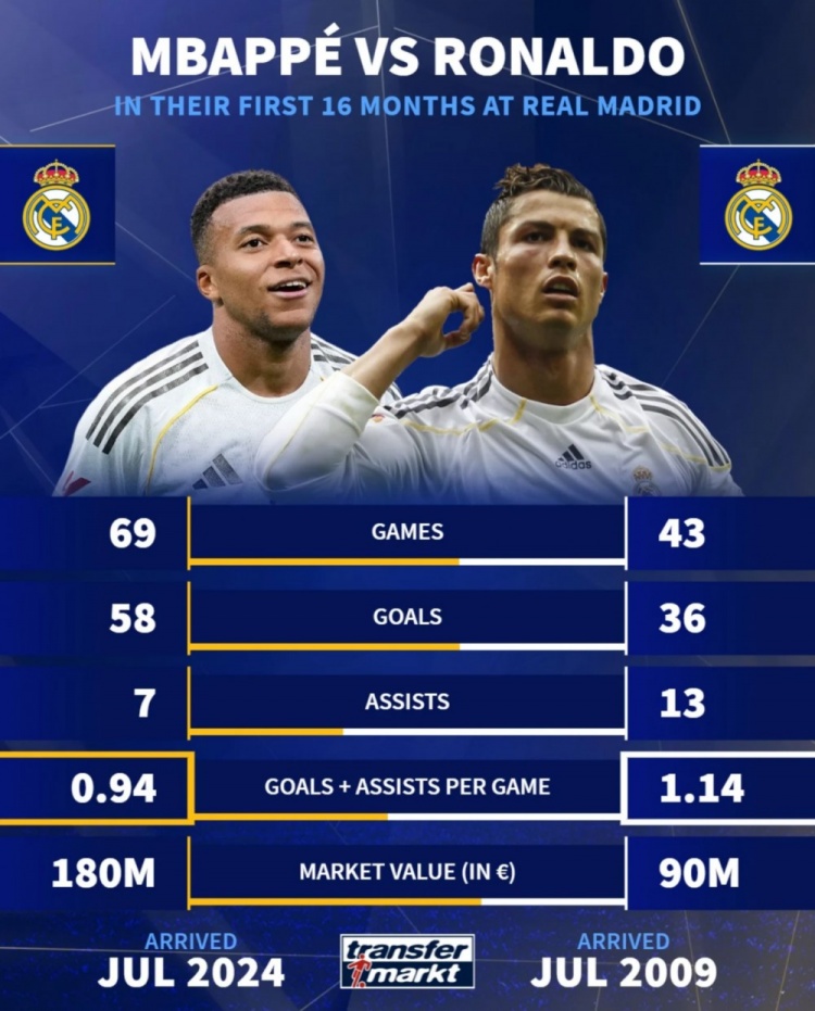 10月8日讯 姆巴佩已为皇马服从16个月,德国转会阛阓统计了他与C罗在皇马同时的数据。