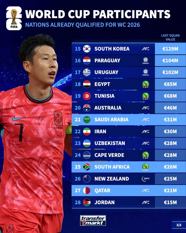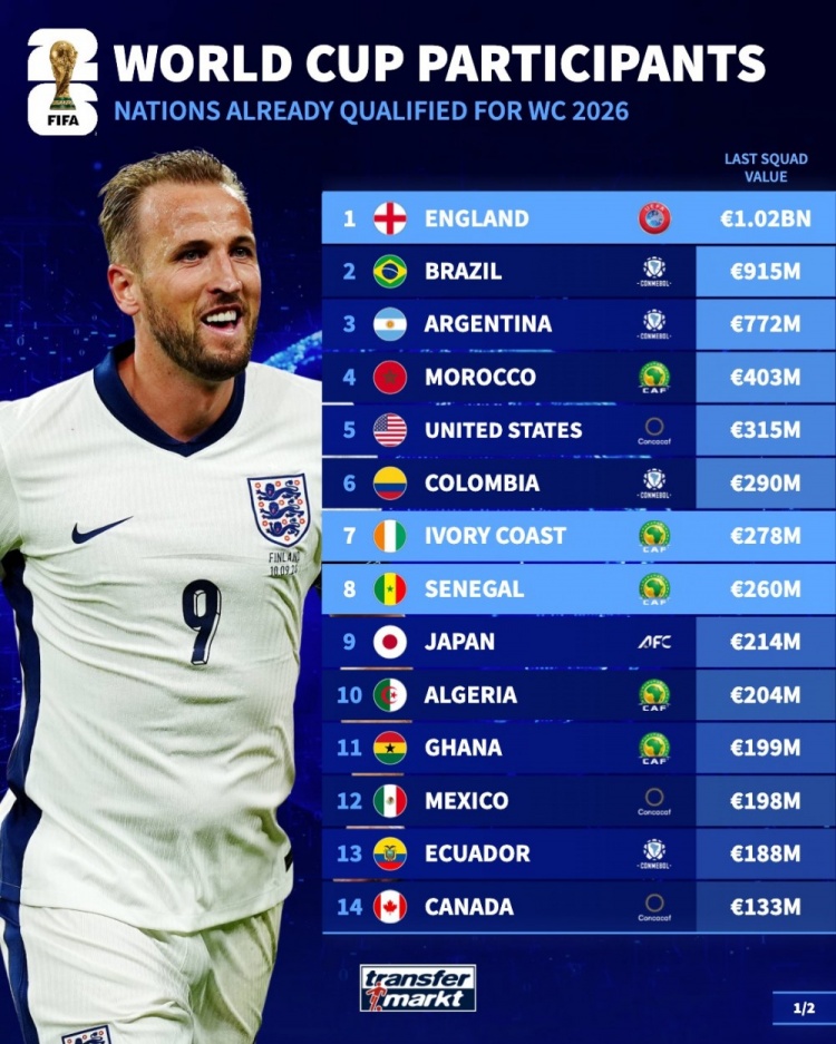 10月15日讯 德国转会商场列出了锁定来岁全国杯履历球队的身价排行,英格兰10.2亿欧居首,巴西、阿根廷二三位。