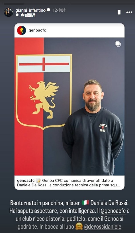 11月7日讯 德罗西昨日致密出任热那亚主帅,国外足联主席因凡蒂诺在我方的ins上向这位前罗马传说奉上了祝愿。