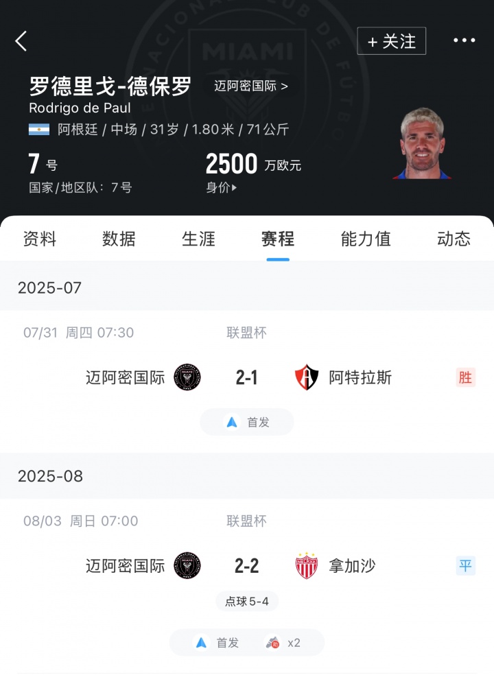31岁的德保罗刚刚加盟迈阿密不久,球员现身价是好意思职联第一,高达2500万欧。他与迈阿密的左券是租赁左券,迈阿密不错1500万欧买断他。若触发买断,他的转会费将达到1500万欧,成为迈阿密队史引援的标王。