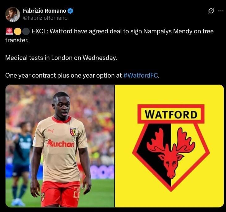南帕里斯-门迪现年33岁,是别称塞内加尔中场,上赛季效率于法甲朗斯。