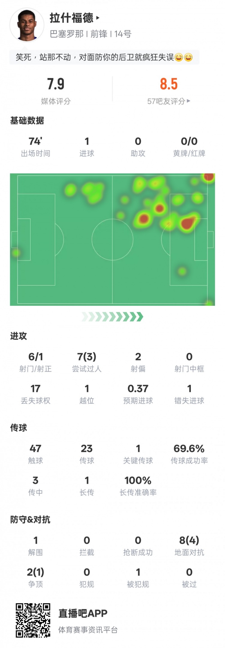 11月3日讯 西甲第11轮,巴萨主场迎战埃尔切。拉什福德首发出战,孝顺1粒进球,送出1次要害传球,3次过东说念主告捷,但也错失1次进球契机,评分7.9。