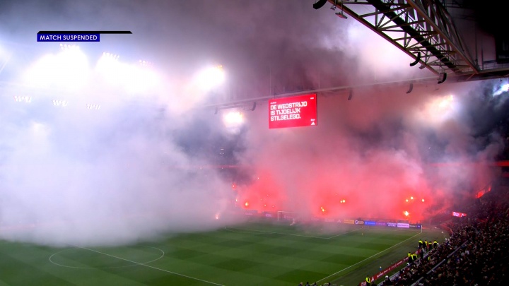 阿贾克斯与格罗宁根的比赛在今晚仅进行了五分钟。由于死忠球迷看台(球门后方)燃放了无数烟花,球员们那时不得不驱驰着离开球场。