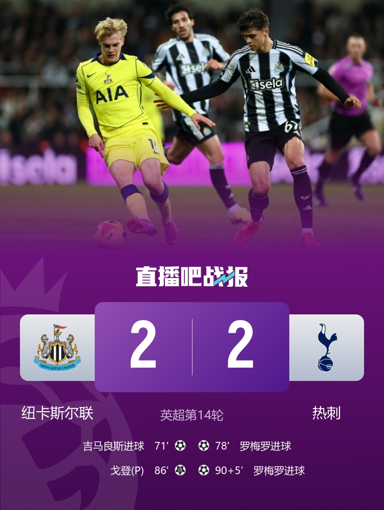 绝平!热刺2-2纽卡五轮不堪 罗梅罗双响+倒钩绝平吉马良斯破门