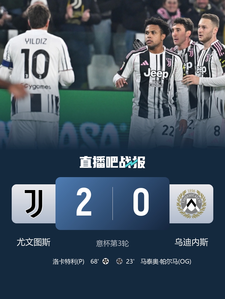 麦肯尼传中造乌龙,洛卡特利点射,最终尤文2-0乌迪内斯晋级。
