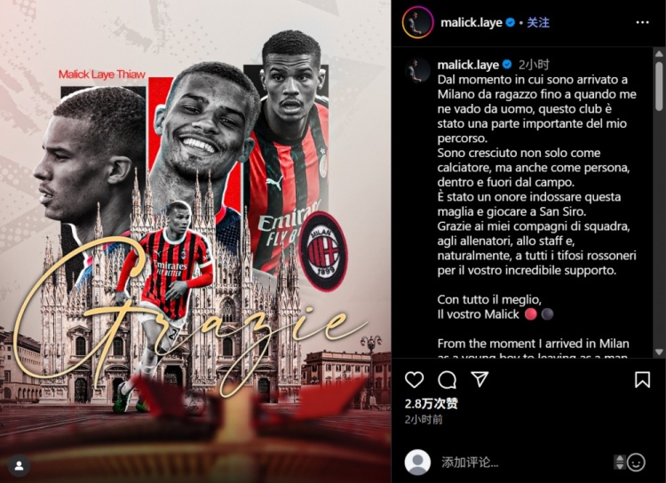 8月14日讯 夏窗佳夫从米兰转会纽卡,交往也曾官宣。这名后卫在个东谈主社媒发文,向米兰告别。