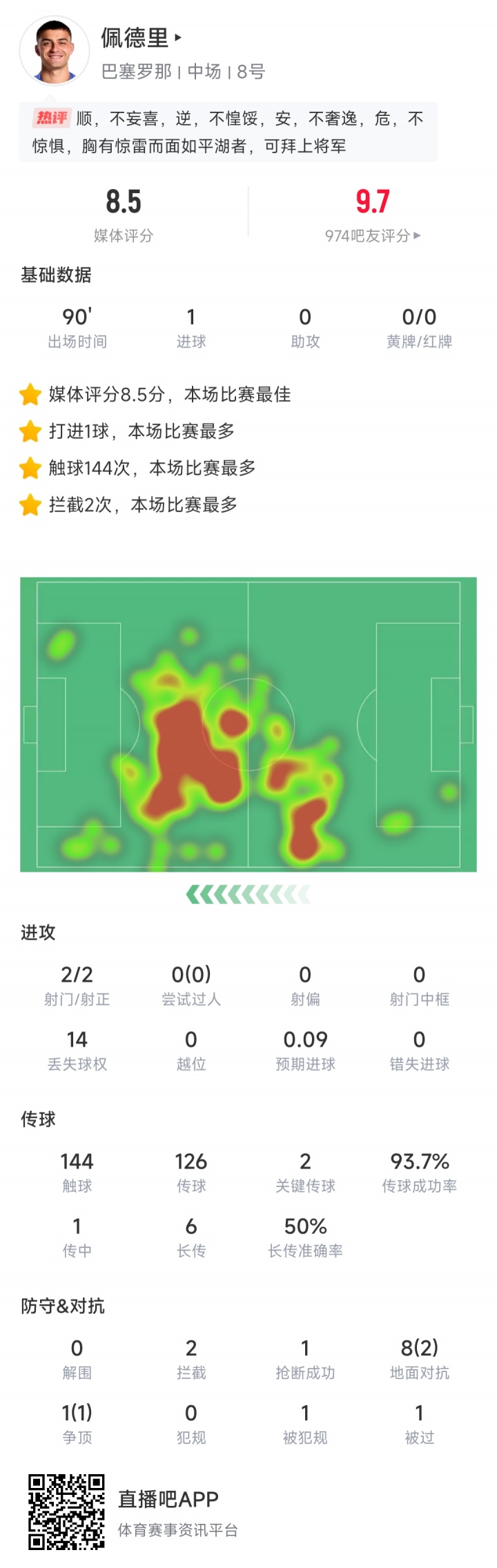 此役佩德里轰出1记天下波,送出2次要津传球,全场他累计触球144次,送出126次传球,传球奏效能93.7%。,奏效当选全场最好球员。