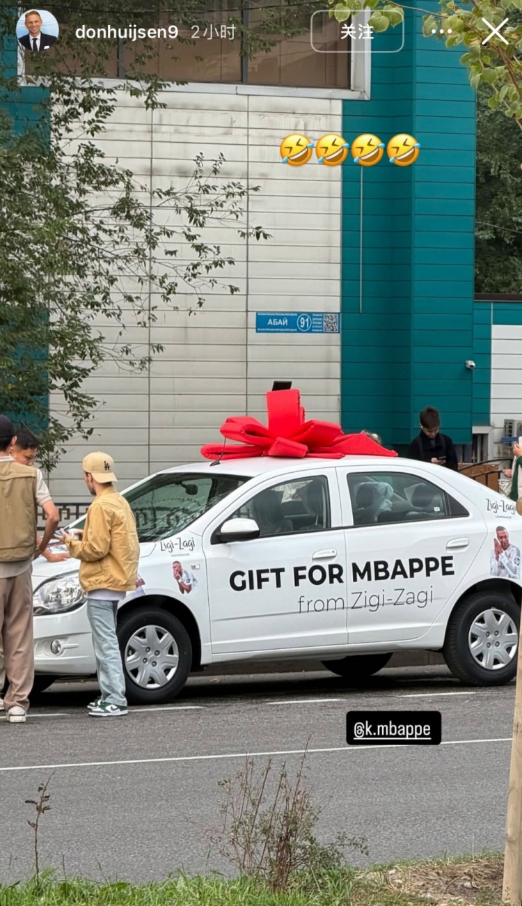 相片中阿拉木图街头靠岸着一辆喷有姆巴佩涂鸦的汽车,唐纳德-赫伊森也将这张相片@了姆巴佩,并附上4个“笑哭”颜料。