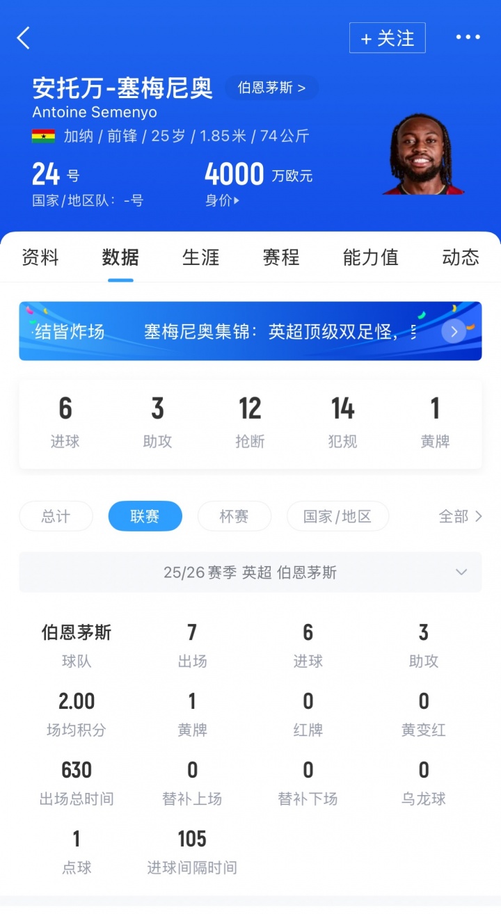 而伯恩茅斯方面合计,现年25岁的塞梅尼奥如今至少值7500万镑,本赛季于今,他还是斩获6个联赛进球,并孝顺3次助攻。