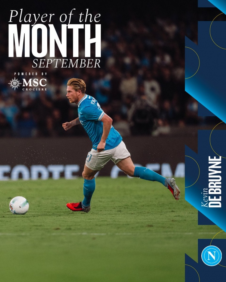 10月8日讯 那不勒斯官方布告,德布劳内当选球迷票选的9月份最好球员。