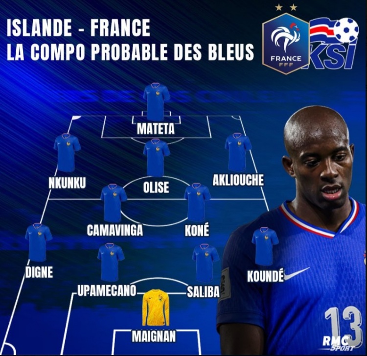 10月13日讯 北京时辰周二凌晨的世初赛欧洲区小组赛,法国将赶赴客场挑战冰岛。RMC对本场比赛的首发声势进行瞻望,马特塔首发,于帕梅卡诺和萨利巴搭档中卫。