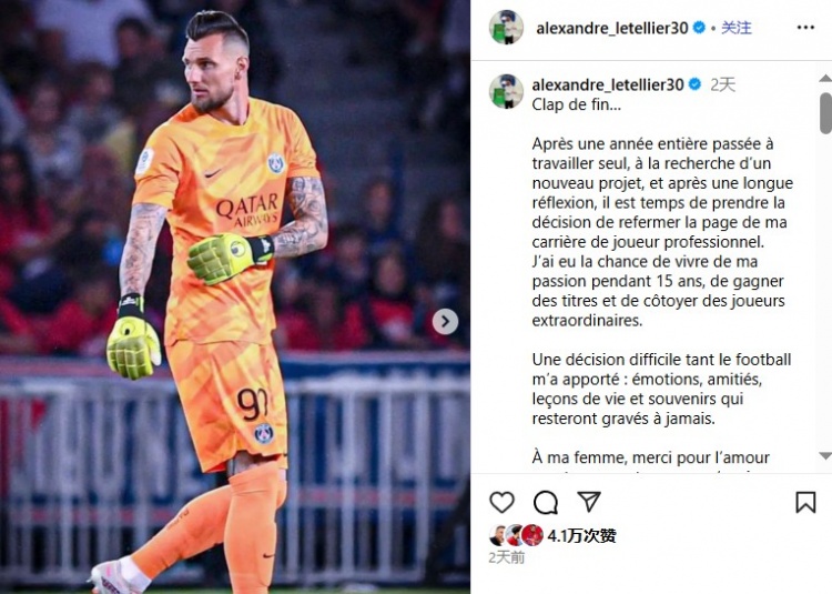 10月15日讯 34岁前巴黎圣日耳曼门将莱特利尔在社媒秘书,适度15年的干事糊口。