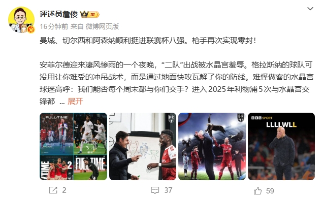 10月30日讯 联赛杯截至多场对阵,其中利物浦惨败于水晶宫,无缘晋级。赛后挑剔员詹俊发文。