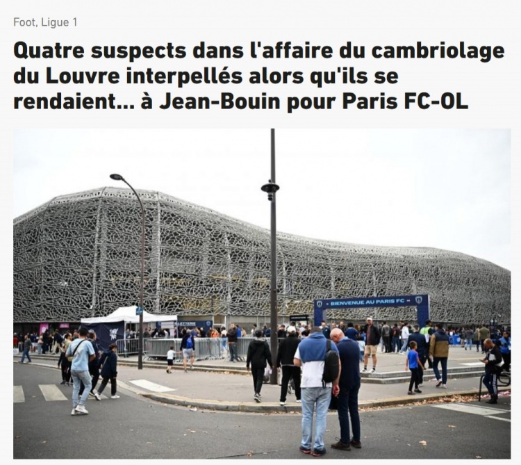 10月31日讯 据法媒报说念,卢浮宫盗窃案有5名新嫌疑东说念主被捕,其中4东说念主被捕时正在前去让-布安球场不雅看巴黎FC和里昂的法甲比赛。