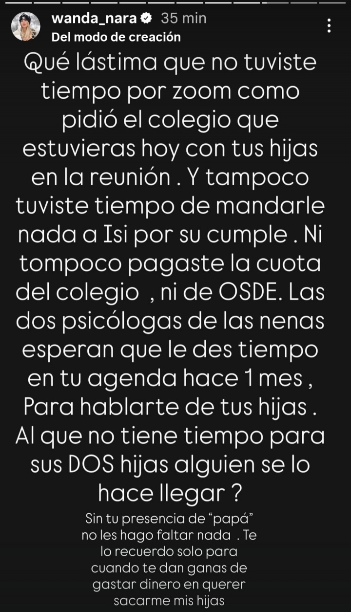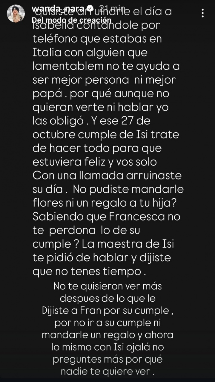 旺达:你思通过电话告诉伊莎贝拉你很缺憾防卫大利和一个不成让你成为更好的东谈主、也不成让你成为更好爸爸的东谈主在一皆,以此放手她的一天。尽管她们不思见你、不思和你语言,我还是将就她们(和你关连)。10 月27日伊西的诞辰,我勇猛让她欢乐,而你只打了一个电话就毁了她的一天。你就不成给你男儿送束花或一份礼物吗?你明知弗朗西斯卡还没谅解你没投入她的诞辰、没送她礼物,目下对伊西又故技重施。希望你别再问为什么没东谈主思见你了。