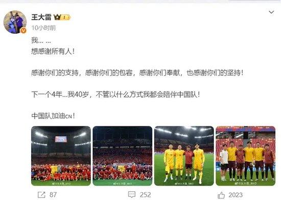 6月10日,世初赛18强赛收官战,国足1比0打败巴林,王大雷首发踢满全场,这可能是他终末一场世初赛。赛后,王大雷在外交收集上发声,直言将来无论以什么神志,齐会奉陪中国队。
