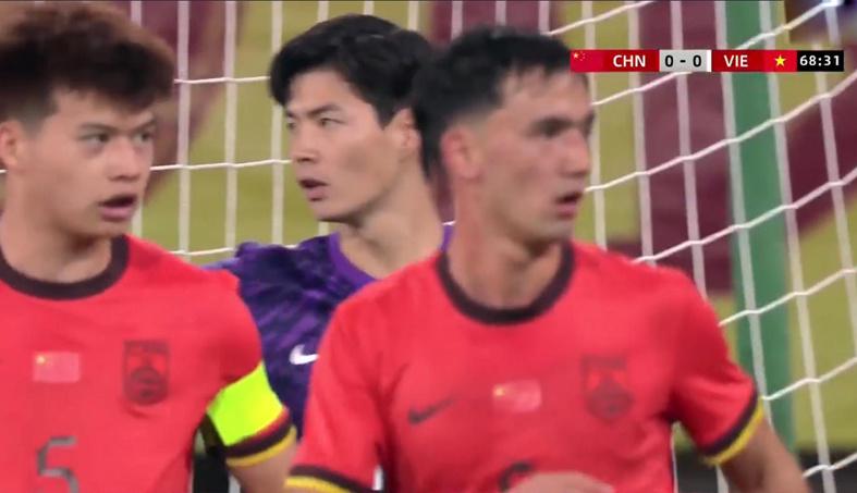 第81分钟,越南队左肋冲破后横传,国足联络两名防备球员突围谬妄
